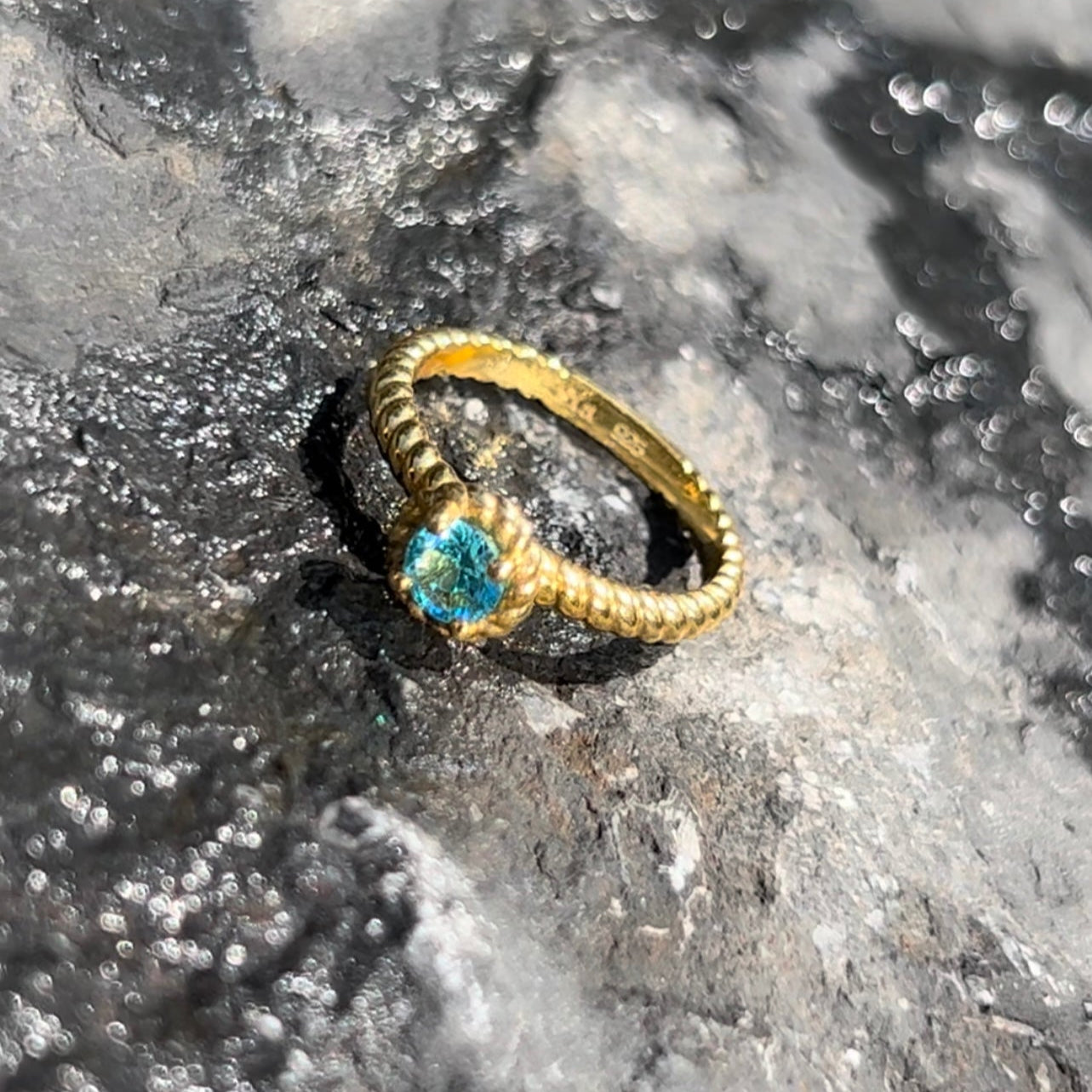This handcrafted birthstone ring is made in 925 sterling silver and plated in 18K gold vermeil. It features a twisted rope band and a prong-set Swiss-grade cubic zirconia at the center, available in the birthstone of your choice. The stone offers the richness and depth of a fine gemstone. Whether it’s your birth month or a meaningful color you love, this ring adds a personal touch to any stack