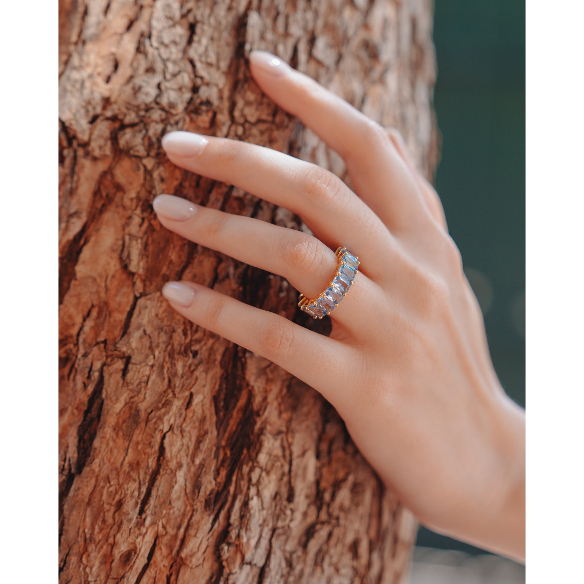 It features a continuous row of Swiss-grade cubic zirconia in a brilliant blue topaz shade, each stone carefully set by hand. The stones offer the richness and depth of a fine gemstone. Blue topaz is the birthstone for December, symbolizing calm, clarity, and communication, making this ring both eye-catching and meaningful.