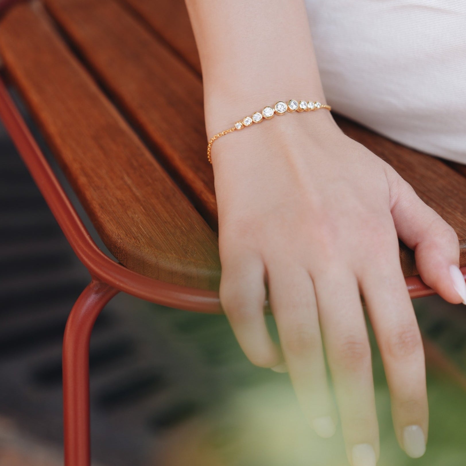 It features a delicate line of bezel-set Swiss-grade white cubic zirconia crystals, graduated in size for a refined, balanced look. Each crystal is hand-set. Elegant on its own or layered for a stacked look, this piece adds refined sparkle to any occasion.