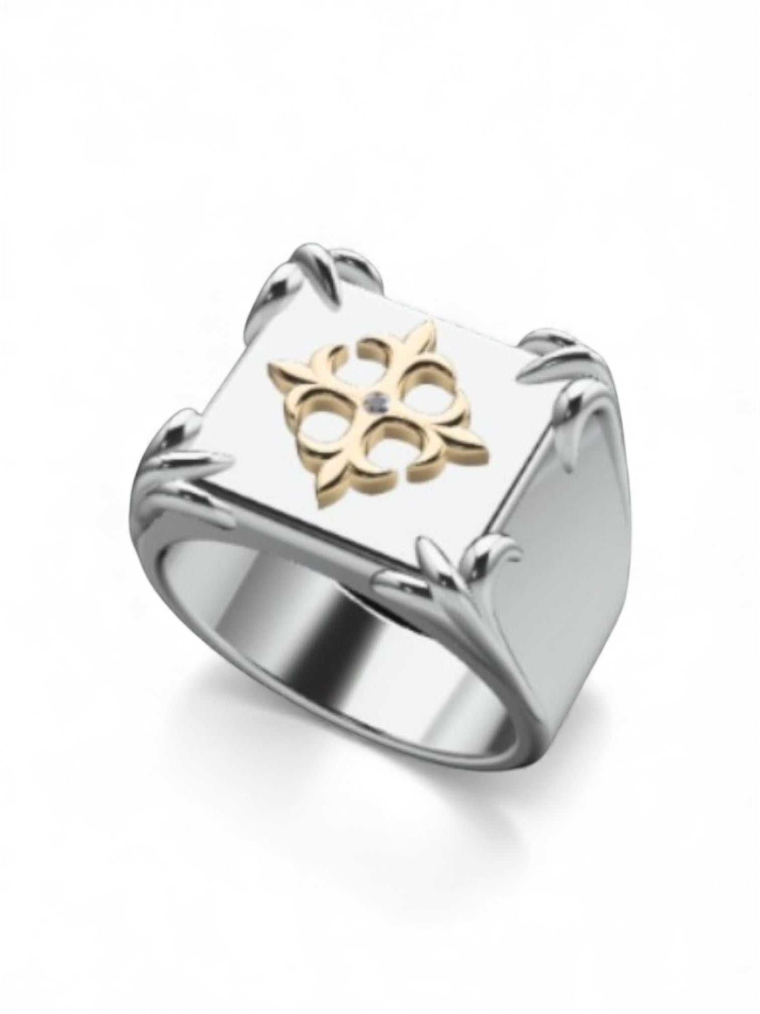 A bold signet. This handcrafted ring features a polished sterling silver base crowned with a raised 10 gold fleur motif, symbolizing growth, strength, and legacy.
